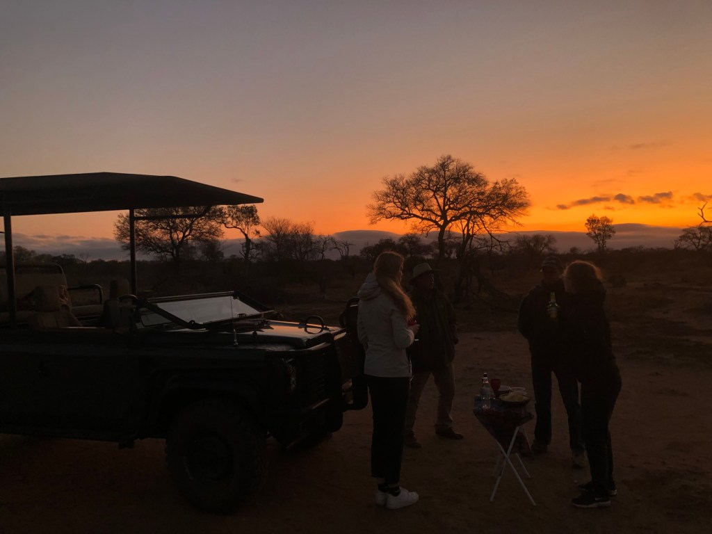 The night drive followed after Sundowners were enjoyed on an open plain. The most spectacular Sunset was enjoyed with Mariepskop in the Background.