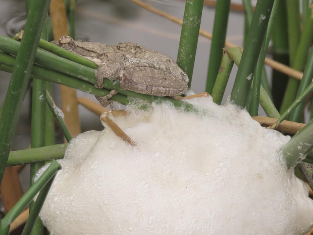Grey foam-nest tree frogs are known for simultaneous polyandry, where female frogs have multiple mates on separate territories that guard the eggs and care for young. This behaviour is owed to their external fertilization mechanism. During the mating process, the female frog produces a foam nest, typically on branches that hang above bodies of water, in order to keep her eggs moist as they develop. This practice is what gives the grey foam-nest tree frogs their name.