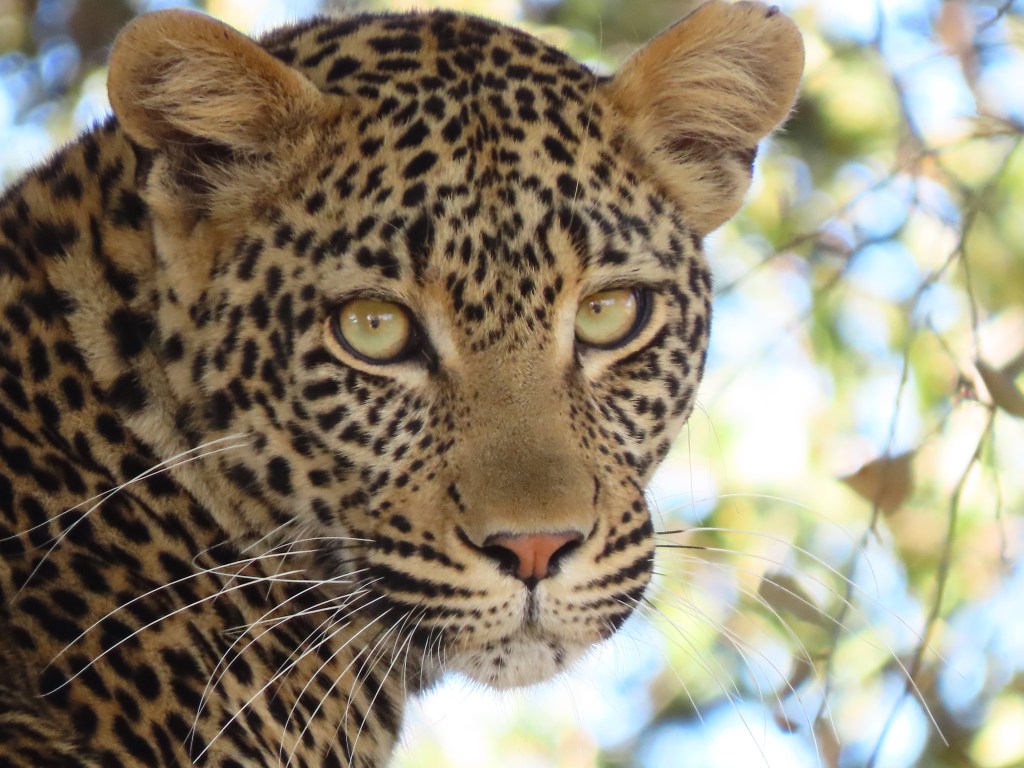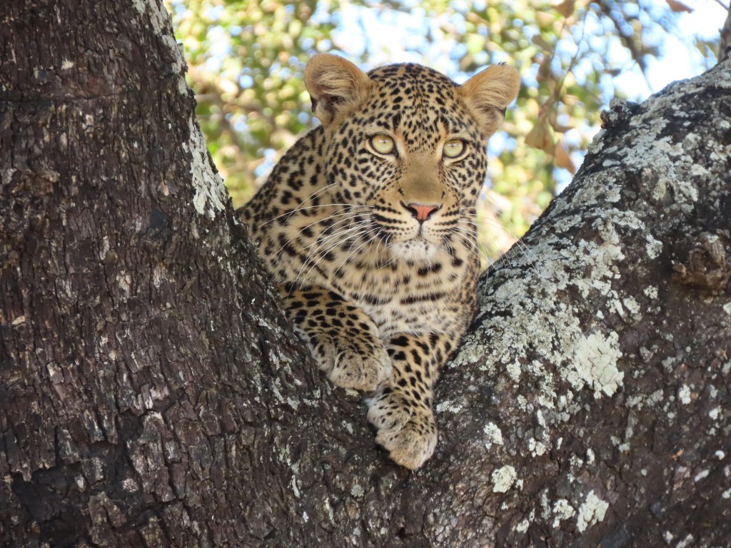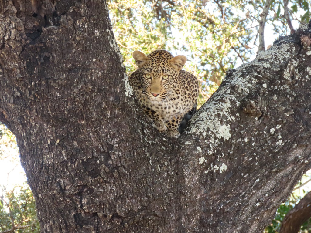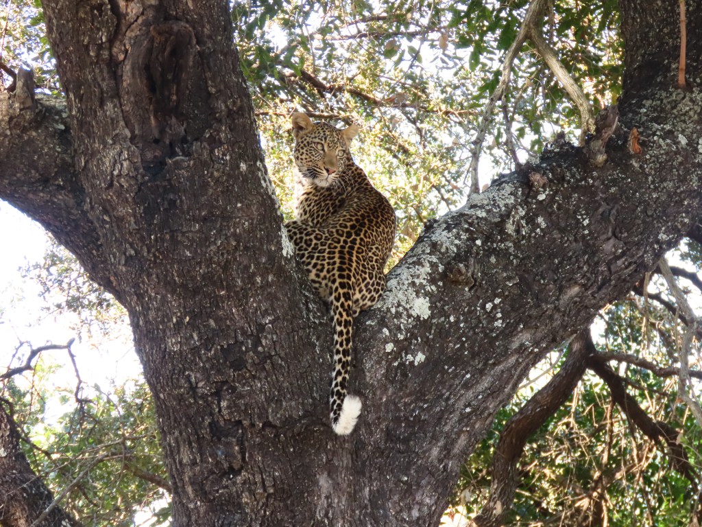 The highlight of the day came a short while after turning onto the S100. As we passed a big Jackalberry Sam spotted the ELUSIVE ONE! A gorgeous Female Leopard. He managed to stop literally next to the tree she was sitting in, fortunately on the opposite side of the road as it allowed for beautiful photos and also for us just to sit there and look at this amazingly beautiful cat. We sat with her for quite a while before the next vehicle arrived. As they did not have our superior vantage point, we indicated to them to park next to us as we were in the higher vehicle and we could look over them. They were very appreciative of this once they were able to see our view. This made it a very special day for myself and the guests, as I have not had a Leopard Sighting in quite a while and it was their first time ever!.